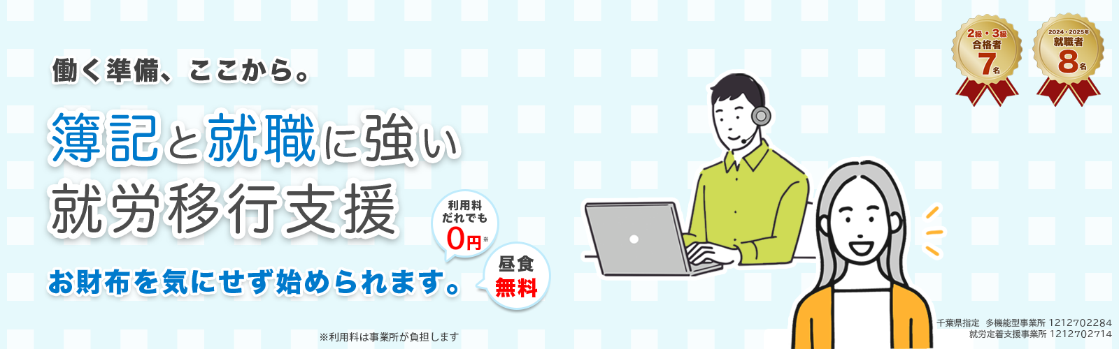 お金の不安を少なくして働く準備を整えてほしいから、利用料は0円(事業所が負担)。昼食無料・交通費・資格取得の受験料も補助します。